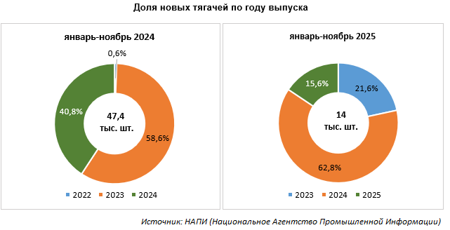 Рассматривая продажи новых седельных тягачей, можно отметить, что в январе-ноябре 2025 года было реализовано 14 тыс. ед. техники, что на 70,5% меньше, чем в 2024 году. По итогам 11 месяцев 2024 года доля техники того же года выпуска составляла 40,8%, в 2025 году она упала до 15,6%. Отметим, что в текущем году сократились импорт и производство тягачей, так как на рынок давят стоки 2024 и 2023 годов. В январе-ноябре 2025 года 62,8% продаж приходилось на прошлогоднюю технику и 21,6% – на тягачи 2023 г.в. В аналогичный период 2024 года доля продаж прошлогодней техники была чуть ниже (58,6%).