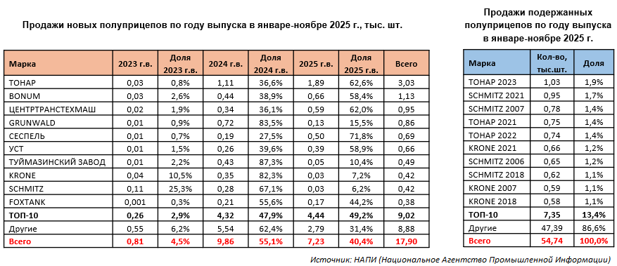 В продажах подержанных полуприцепов в январе-ноябре 2025 года лидирует техника ТОНАР 2023 г.в., ее доля от общих продаж составляет 1,9%. Также в ТОП-10 попали полуприцепы ТОНАР 2021 и 2022 г.в., SCHMITZ 2006, 2007, 2018, 2021 г.в., KRONE 2007, 2018 и 2021 г.в.