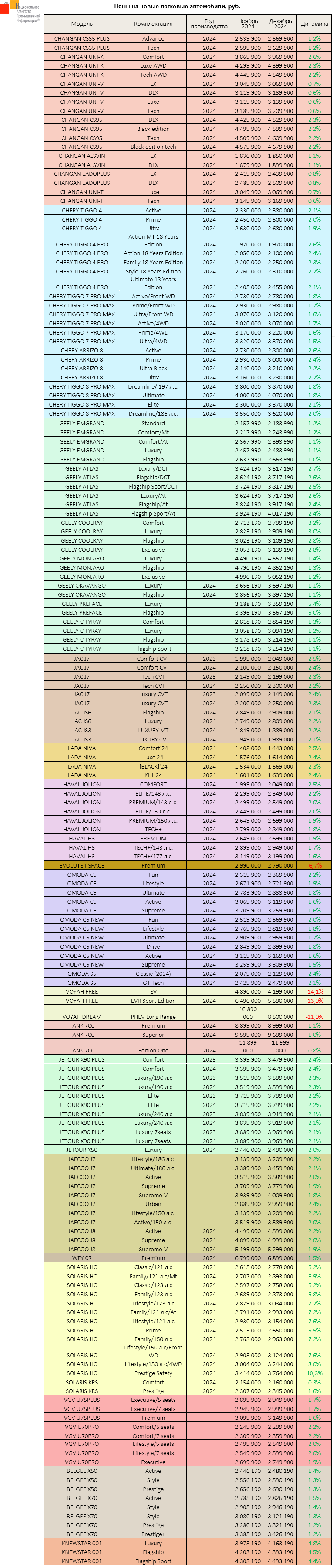 Маркетинговое агентство НАПИ проанализировало рекомендованные розничные цены (РРЦ) на новые легковые автомобили в декабре 2024 г. По сравнению с ноябрем 2024 г. изменились цены на 158 комплектаций. Снизились цены на 4 комплектации EVOLUTE и VOYAH. Снижение цен составило от 6,7% до 21,9%. Цены на 154 комплектации CHANGAN, CHERY, GEELY, JAC, LADA, HAVAL, OMODA, TANK, JETOUR, JAECOO, WEY, SOLARIS, VGV, BELGEE, KNEWSTAR в декабре выросли. Рост цен составил от 0,3% до 10,3%.
