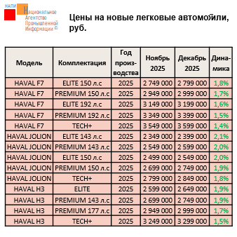Маркетинговое агентство НАПИ проанализировало рекомендованные розничные цены (РРЦ) на новые легковые автомобили в декабре 2025 года. По сравнению с ноябрем текущего года изменились цены на 38 комплектаций, все они подорожали. В цене выросли комплектации моделей HAVAL, HONGQI, SWM, WEY, SOLARIS, BELGEE, EXLANTIX и AMBERAUTO. Прирост составил от 0,7% до 24,6%.