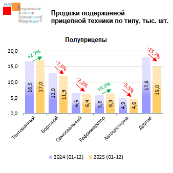 По данным НАПИ, за янв.-дек. 2025 г. было продано 61,3 тыс. подержанных полуприцепов, на 5% меньше, чем в 2024 г. Продажи ТОП-5 типов техники среди полуприцепов снизились на 0,9%. Сильнее всего сократились сегменты бортовых полуприцепов (-7,5%) и автоцистерн (-5,5%). Выросли продажи подержанных тентованных полуприцепов (+2,7%) и рефрижераторов (+9,3%)…