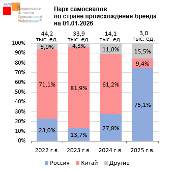 По данным НАПИ, в парке самосвалов на 01.01.2026 насчитывается 886,9 тыс. ед. техники. Общая доля свежей техники 2022-2025 годов выпуска составляет 10,8% парка. Из нее больше всего в парке числится самосвалов 2022 года выпуска – 44,2 тыс. ед., что составляет 5,0% парка. На самосвалы 2023 г.в. приходится 2025 г.в. – 0,3% (3,0 тыс. ед.), 2024 г.в. – 1,6% (14,1 тыс. ед.), 2025 г.в. – 0,3% (3,0 тыс. ед.) …