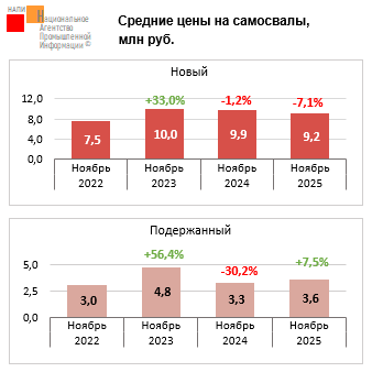 По данным НАПИ, в ноябре 2025 года средняя цена на новый самосвал составила 9,2 млн рублей, что на 22,1% больше, чем в ноябре 2022 года. Стоимость подержанного самосвала составила 3,6 млн рублей, что на 17,5% выше его цены три года назад. В прошлом месяце, по сравнению с ноябрем 2024 года, средняя цена на новый самосвал снизилась на 7,1%, а на подержанный выросла на 7,5%.