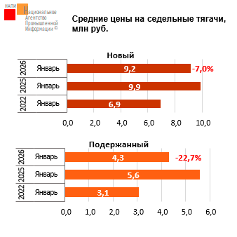Маркетинговое агентство НАПИ проанализировало динамику средних цен на новые и подержанные* седельные тягачи. В январе 2026 года снизились цены на новые тягачи, стоимость техники составила 9,2 млн рублей (-7%). Значительнее сократилась средняя цена на подержанную технику, стоимость тягача снизилась до 4,3 млн рублей (-22,7%)…