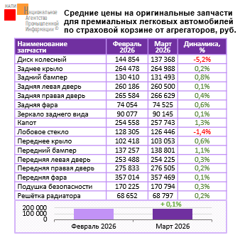Маркетинговое агентство НАПИ проанализировало цены на оригинальные запчасти по страховой корзине для премиальных легковых автомобилей от агрегаторов. За месяц, с февраля по март 2026 года, средняя цена на оригинальные запчасти выросла на 0,1%. Значительнее всего цены повысились на капот (1,3%) и передний бампер (1,1%)…