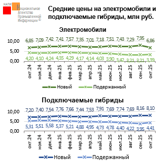 По данным НАПИ, с сентября по октябрь 2025 года цена на новые электрокары снизилась на 13,7%, на новые гибриды – на 0,7%. При этом, стоимость подержанных электромобилей выросла на 5,7%, а подержанных гибридных автомобилей – на 11,6%. За год, с октября 2024 года по октябрь 2025 года, цена на новые электромобили почти не изменилась и составила 6,86 млн рублей …