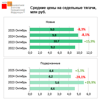 Маркетинговое агентство НАПИ проанализировало динамику средних цен на новые и подержанные* седельные тягачи. В октябре 2025 года немного упали в цене новые тягачи, стоимость техники составила 9 млн рублей (-8,3%). В то же время средняя цена на подержанную технику немного выросла, стоимость тягача достигла 4,4 млн рублей (+3,3%)…