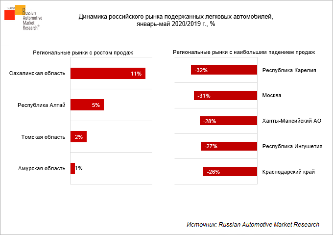 Согласно данным Russian Automotive Market Research, за пять месяцев 2020 года продажи подержанных легковых автомобилей в России снизились на 14% по сравнению с аналогичным периодом 2019 года и составили 1 755 тыс. ед. При этом, в 4 субъектах РФ вторичный рынок показал рост.
