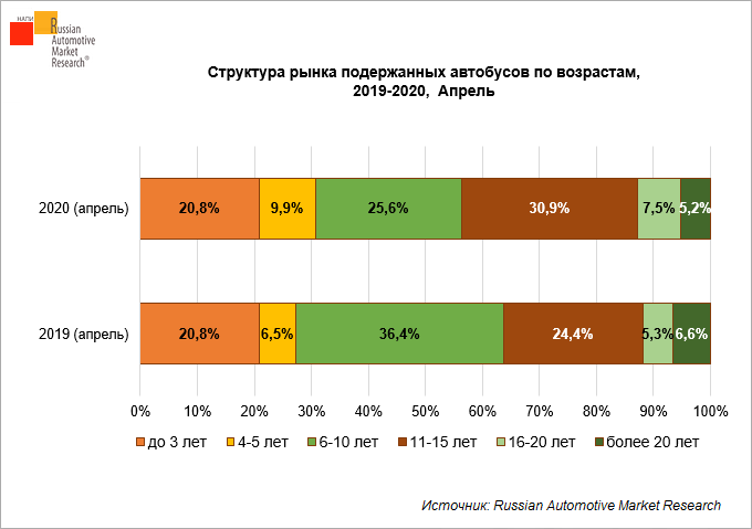 В апреле 2020 г. продажи подержанных автобусов сократились на 54,9% по сравнению с апрелем прошлого года и составили 996 единиц. На вторичном рынке автобусов в апреле 2020 г. наибольшим спросом пользовались автобусы возрастом 11-15 лет, их доля увеличилась на 6,5% до 30,9%. Доля автобусов возрастом 6-10 лет – самой востребованной группы в апреле 2019 г. – напротив, сократилась на 10,8% до 25,6%.