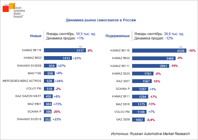 По данным Russian Automotive Market Research, в сентябре 2020 года на российском рынке продано 1,4 тыс. новых самосвалов. Это на 21% больше результата сентября 2019 года. По итогам девяти месяцев 2020 года первичный рынок самосвалов вырос на 1% и достиг 10,5 тыс. ед.