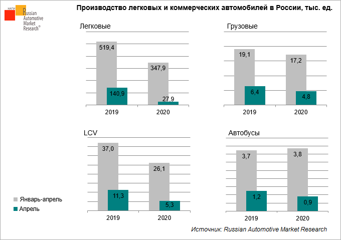 По данным Russian Automotive Market Research, в апреле 2020 г. в России произведено 27,9 тыс. легковых автомобилей, что на 80% меньше производственного результата апреля 2019 г. В апреле 2020 г. все российские предприятия, выпускающие легковые автомобили, сократили объемы производства, за исключением «Мерседес-Бенц Мануфэкчуринг Рус» и «Хавейл Мотор Мануфэкчуринг Рус», первые автомобили с конвейеров которых сошли в мае 2019 г.