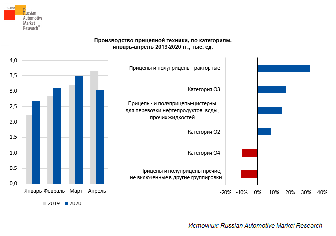 Положительная динамика производства в январе-апреле 2020 года отмечена среди прицепной техники категории О2 (технически допустимой максимальной массой свыше 0,75 т, но не более 3,5 т), категории О3 (3,5 т < ТДММ < 10 т), прицепов и полуприцепов тракторных, а также прицепов- и полуприцепов-цистерн для перевозки нефтепродуктов, воды и прочих жидкостей.