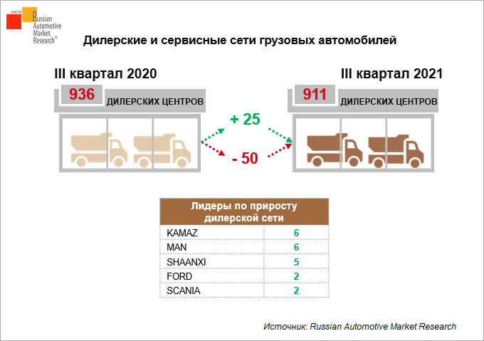 На фоне сокращения общего числа автоцентров некоторые бренды расширили дилерскую сеть. Лидерами по приросту дилерской сети стали бренды: KAMAZ (+6 ед.), MAN (+6 ед.), SHAANXI (+5 ед.) и FORD (+2 ед.), SCANIA (+2 ед.).