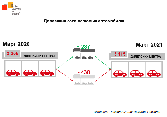 По данным Russian Automotive Market Research, на март 2021 г. в России насчитывается 3 115 центров продаж новых легковых автомобилей. Это на 151 автоцентр меньше, чем годом ранее.