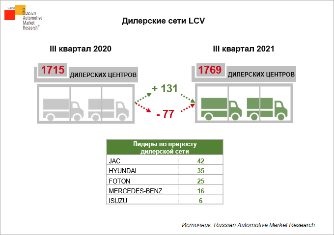 По данным Russian Automotive Market Research, в третьем квартале 2021 г. в России насчитывается 1769 центров продаж новых легких коммерческих автомобилей. Это на 54 автоцентра больше, чем годом ранее.