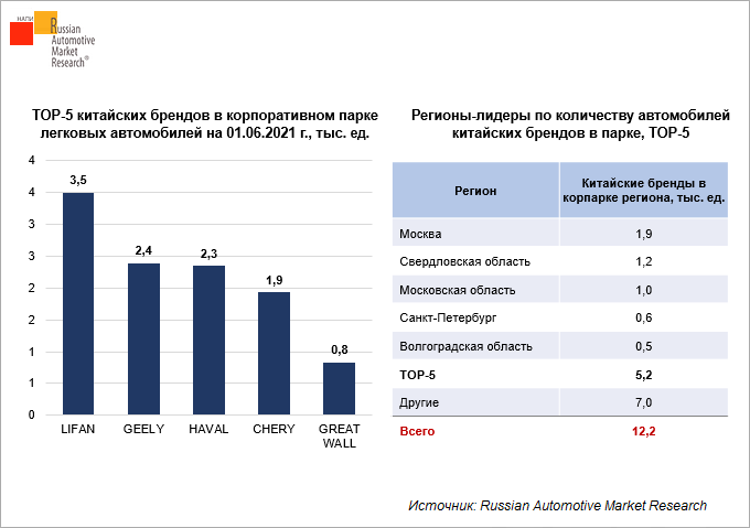 Доля китайских брендов в корпоративных парках легковых автомобилей составляет 0,6%. Первое место среди китайских брендов занял бренд LIFAN (3,5 тыс. ед.).