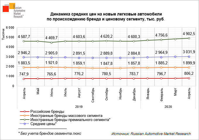 В апреле 2020 г. средние цен на новые легковые автомобили* выросли на 2,9% по сравнению с апрелем 2019 г. Наибольший рост средних цен – на 7,8% - показали российские бренды. Рост средних цен на автомобили иностранных брендов массового и премиального* сегментов составил 0,9% и 6,9%, соответственно.