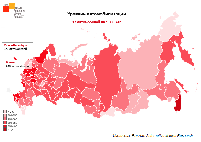 В среднем в России на 1 тыс. жителей приходится 317 легковых автомобилей. В 36 регионах РФ уровень автомобилизации выше среднего по стране. Самая высокая обеспеченность легковыми автомобилями в Приморском крае - 468 автомобилей на 1 тыс. жителей.