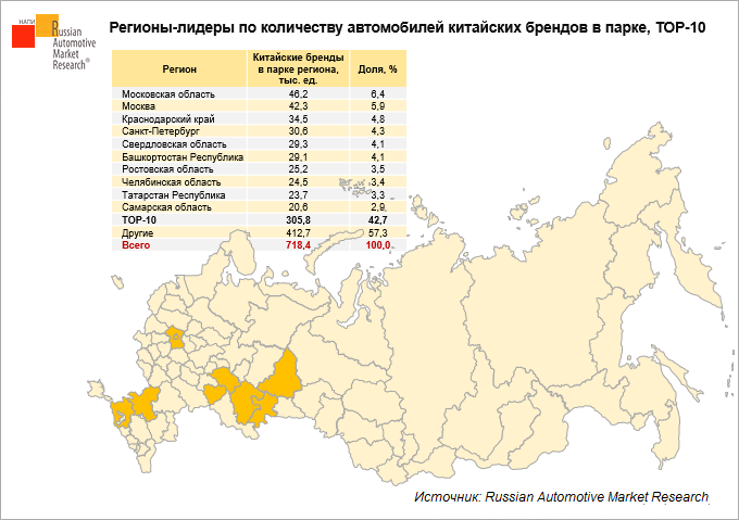 Первое место по количеству автомобилей китайских брендов в парке занимает Московская область – 46,2 тыс. ед. На втором месте идет Москва – 42,3 тыс. автомобилей. Третье место по количеству китайских автомобилей принадлежит Краснодарскому краю – 34,5 тыс. ед.