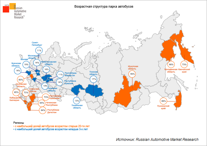 На долю автобусной техники возрастом старше 20 лет приходится 38% парка. Среди регионов с самым старым парком автобусов лидирует Республика Дагестан – 84% парка региона. Также большое количество «старых» автобусов насчитывается в Республиках Калмыкия и Северная Осетия, а также в Камчатском крае – 73% в каждом.