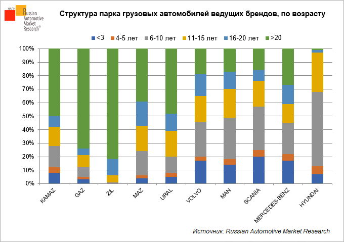 Среди ведущих брендов наиболее возрастные в парке грузовики ZIL: на долю техники старше 20 лет приходится 82% парка данной марки. Также в парке насчитывается большое количество старых грузовых автомобилей GAZ и KAMAZ.