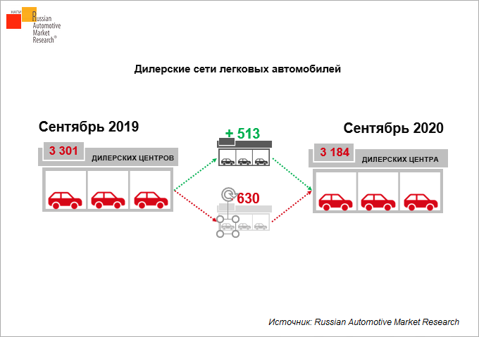 По данным Russian Automotive Market Research, на 1 сентября 2020 г. в России насчитывается 3 184 центра продаж новых легковых автомобилей. Это на 117 автоцентров меньше, чем годом ранее.