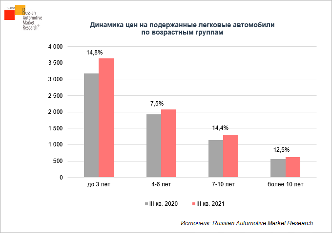 В третьем квартале 2021 г. вслед за ценами на новые автомобили цены на подержанные автомобили всех возрастных групп показали заметный рост относительно третьего квартала 2020 г. При этом наиболее значительно поднялись цены на автомобили возрастом до 3 лет: они прибавили 14,8%.