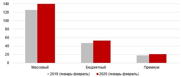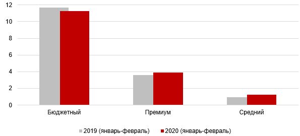 В рассматриваемом периоде продажи новых легковых автомобилей выросли во всех ценовых сегментах. Однако, долю на рынке нарастили только премиальные бренды: с 9,5% в январе-феврале 2019 г. до 9,8% в январе-феврале 2020 г.